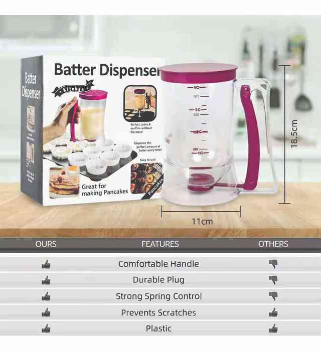 Make baking fun for any age. Effortlessly create perfect looking puff-puff, pancakes, waffles, muffins, or cupcakes with the help of this Batter Dispenser. The wide mouth opening and no drip nozzle makes portion control easy and mess-free.